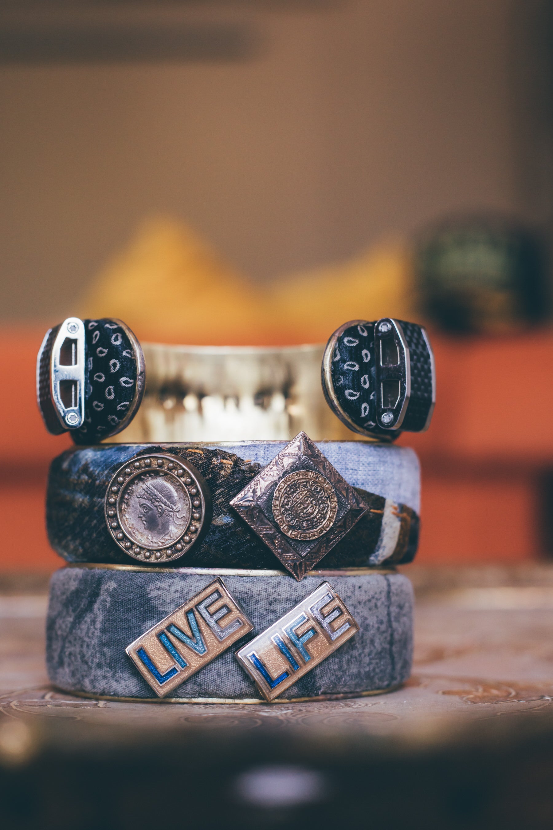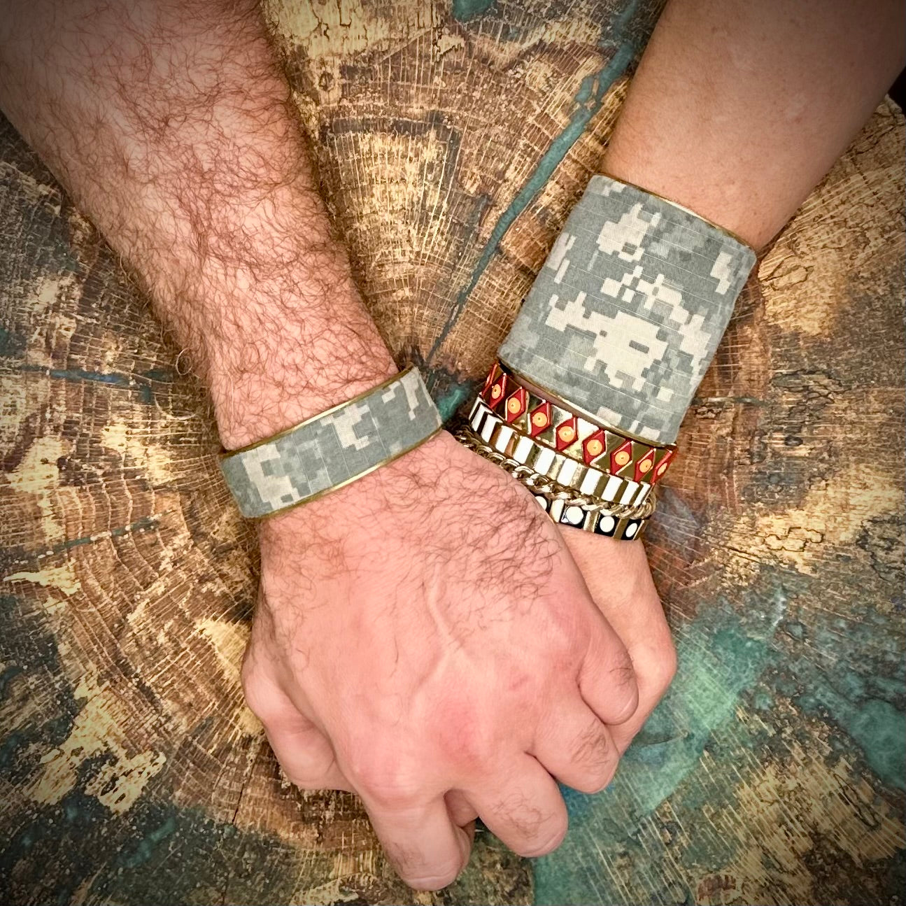 My cuff bracelet story. I went to Round Top Texas for a huge vendor gathering. It was hot, miserably hot in the middle of October. There was a store that was air conditioned and it drew me in. That was the beginning. Once inside I saw a darling young girl who caught my eye due to her eclectic nature and style. We chatted and I asked her what she was selling. She said I make cuffs … bracelets… it is my gift, therapy to survive. I am a survivor. I met her eye and replied, “I am a survivor of loss… we must be kin.” She explained how she makes vintage textiles on brass cuffs stamped inside of them have affirmations and intentions. Conversation continued a bit deeper with our newfound kinship. What a unified world when we take the time to connect. Stories intertwine. She told me that she also creates Custom Design Cuffs within her business and that she saw a need for her customers for her to focus on making Bereavement, Bridal, Military, etc. you name it, she can create. She creates Nostalgic Memory, honoring your loved ones that have passed or to creating a Heirloom of a Lifetime. Her cuffs were displayed .. intriguing but I didn’t purchase. Over the course of a couple of days I had a thought. Would Izzy do something custom just for me? I connected via text and inquired. Her reply….. That is my goal to do what is meaningful to others. You see I have recently experienced great loss in my life …my husband and an adult son. So, I examined their leftover shirts to take the real cuff off something they wore and turn it into a bracelet made by Izzy just for me. My husband’s chambray shirt cuff, a couple of ties and cuff links. My son’s camo shirt and a special set of cuff links that say “LIVE LIFE”. Material connections. I entrusted these to Izzy and left her artistic freedom. Now I wear an art piece of history, my history… my life and have a future with a darling new friend.